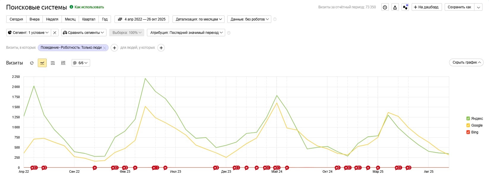 За время работы нам удалось поднять позиции с 43% до 100% в ТОП-10. В ТОП-3 находится 95%. Трафик увеличился на 74%, а количество заявок в 3 раза. Переходы из поисковых систем за последний год составили 53,1%, что составляет 5 369 визитов.