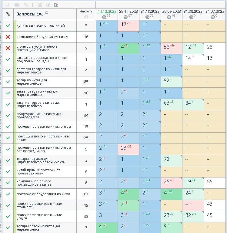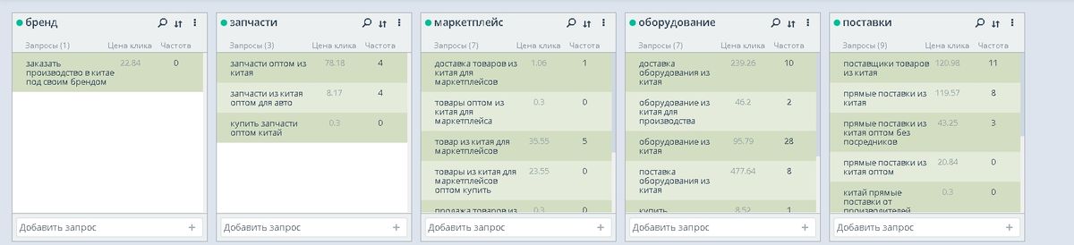 - Сбор запросов по темам: поиск поставщиков в Китае, запчасти из Китая, товары из Китая для маркетплейсов, оборудование из Китая и производство под своим брендом в Китае. Семантическое ядро собиралось, чтобы выстроить четкую структуру для нового сайта: